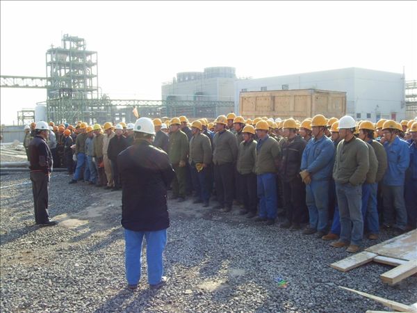 會上,分公司副經(jīng)理欒立超代表分公司對干好EO裝置的重要意義進(jìn)行了分析,并部署了質(zhì)量安全的控制、機(jī)械材料的供應(yīng)、施工技術(shù)服務(wù)等方面的工作。他號召施工人員要把項目的各項工作落到實處,做到措施落實到位、分工明確、責(zé)任到人;同時各個施工小組要認(rèn)真細(xì)化任務(wù),把任務(wù)分解到每一周、每一日,在全場形成你追我趕的大干局面。業(yè)主阿克蘇—諾貝爾乙烯胺(寧波)有限公司的現(xiàn)場項目經(jīng)理和管理公司福斯特惠勒國際工程咨詢(上海)有限公司的現(xiàn)場施工經(jīng)理也在會上給施工人員打氣鼓勵。