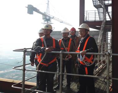 由于此次設備工程分公司承接的寧夏大地循環發展股份有限公司天瑞發電公司4×480t/h型高溫、高壓、循環流化床鍋爐安裝工程,為公司首次承接的最大型鍋爐安裝項目,因此倍受公司關注。14日,胡流芳一行到項目現場后,立即系上安全帶,登上54米高的鍋爐安裝平臺,一層一層的仔細查看安裝施工細節,詳細了解質量過程控制措施,認真檢查各部位的安全防護情況。與此同時,張娣玲對項目部工程施工質量過程控制資料、安全資料等進行了認真檢查,并在項目部安全工作例會上對360多名參建員工就施工安全注意事項進行了重點強調。