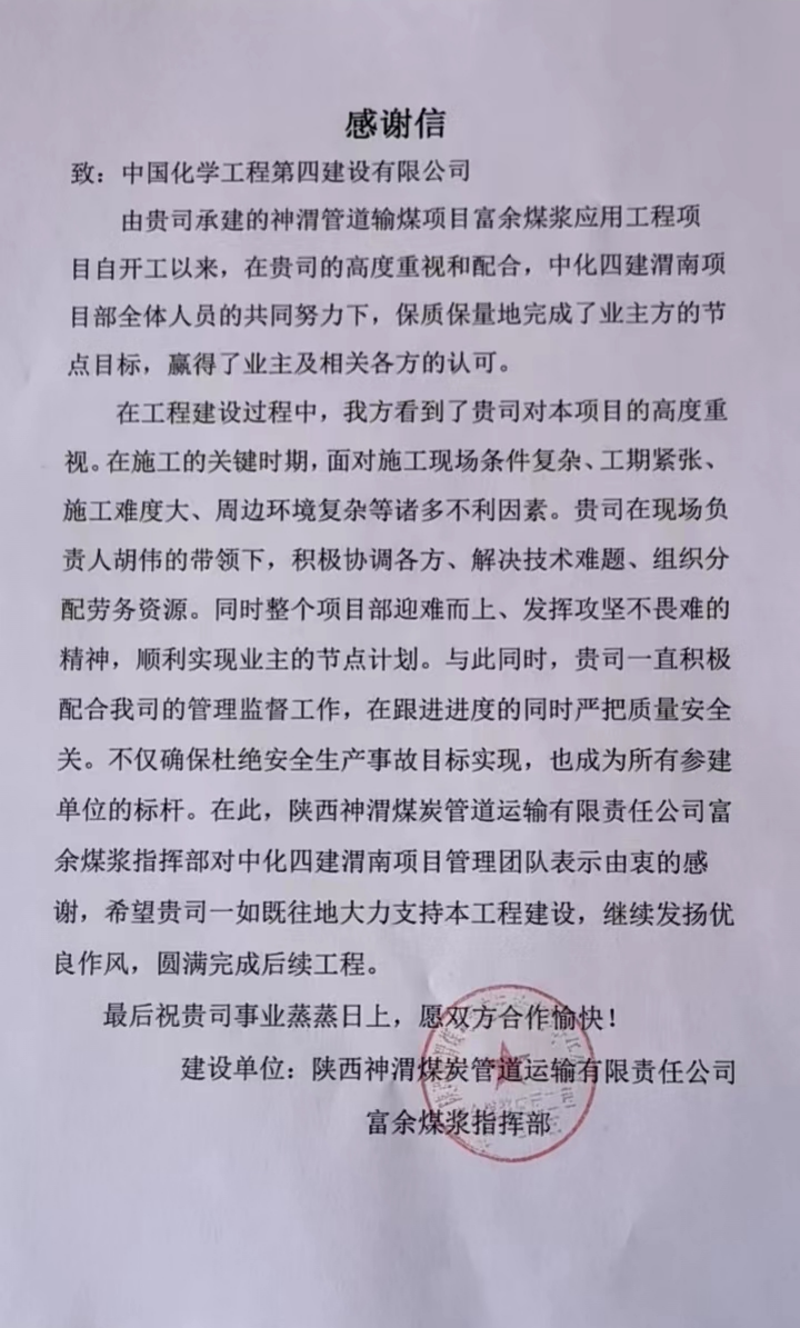 1月5日,中化勞務公司收到陜西神渭煤炭管道運輸有限責任公司富余煤漿指揮部發來的感謝信,對中化勞務承建的神渭管道輸煤項目富余煤漿應用工程項目保質保量完成節點目標,贏得業主及相關各方的認可,表示感謝。