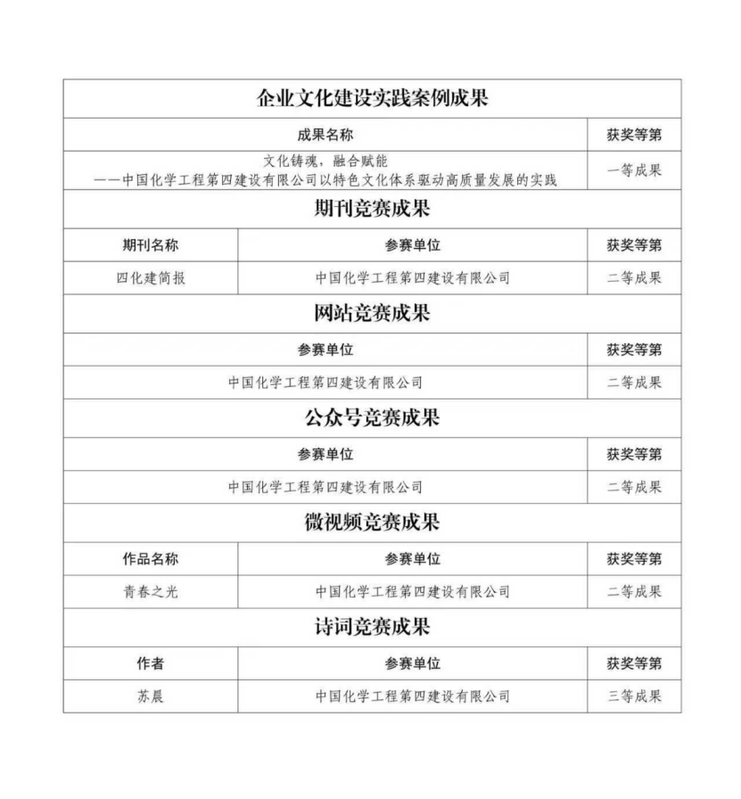 近日,中國施工企業管理協會公布2025年工程建設企業文化建設系列活動競賽結果,中國化學工程第四建設有限公司憑借深厚的文化積淀與創新實踐,一舉斬獲企業文化建設實踐案例一等成果,期刊競賽、微視頻競賽、網站競賽、公眾號競賽二等成果,詩詞競賽三等成果,彰顯了公司企業文化建設的深厚底蘊與創新活力。