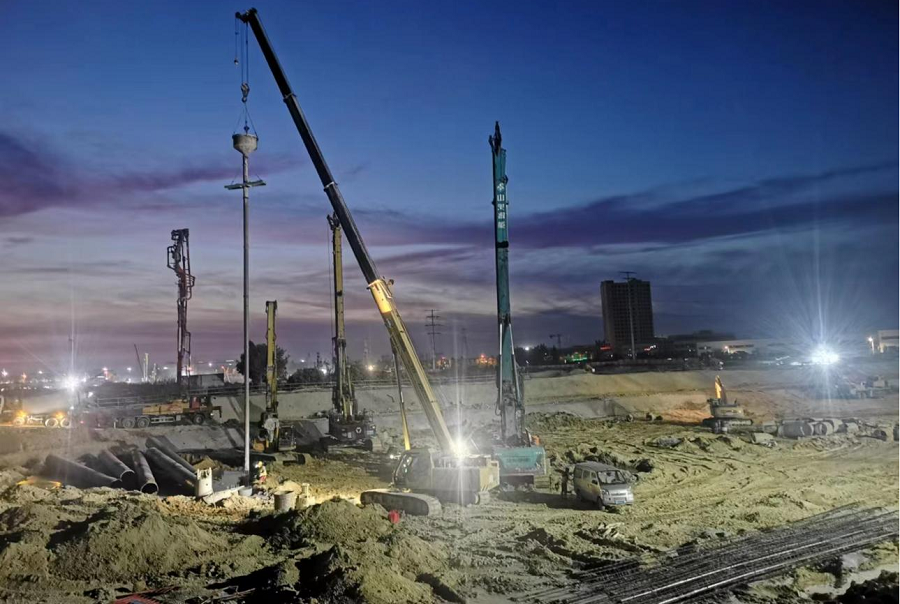 目前,項目A、B、D三個地塊已全面進入大干階段,現(xiàn)場投入鉆機14臺,保證每天完成樁基180根。現(xiàn)已完成樁基1769根,占三個地塊5453根樁基的32%,計劃9月13日前完成三個片區(qū)全部樁基施工和基坑支護工作,屆時項目將全面進入基礎(chǔ)施工階段。