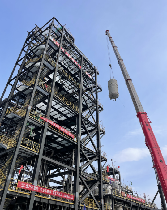 此次吊裝的聚合反應釜,安裝標高44米。面對現場運輸通道狹窄,設備安裝精度要求高等難題,項目部組織專家多次討論吊裝方案,提前規劃運輸路線,并對吊裝場地進行風險排查,及時消除安全隱患。在吊裝中,項目團隊強化安全質量管控,采用300噸的汽車吊進行作業,嚴格控制起吊速度,確保每臺聚合反應釜都平穩吊裝就位,贏得業主一致好評。